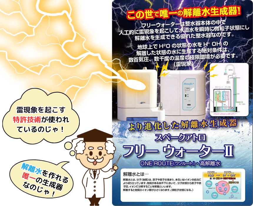 フリーウォーターⅡ FW-551は、本体内で人工的に雷現象を起こして水道水を瞬時に微粒子状態にし解離水を生成できる優れた解離水生成器なのです。以前の機種よりバージョンアップ超解離水の実現に成功しました