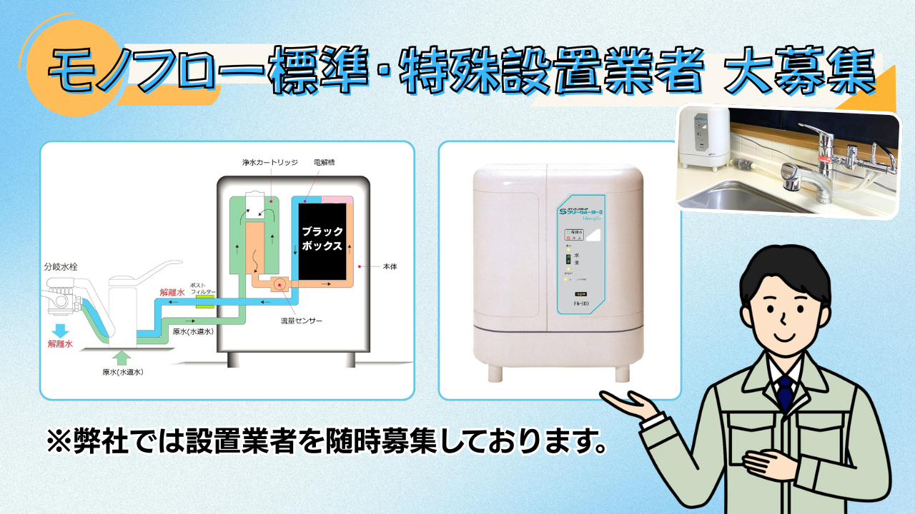 私たちは、健康・環境分野で注目されている「フリーウォーター(解離水)」の普及を目指し、全国各地での機器設置を進めています。現在、当社では解離水生成装置の設置を担っていただける信頼できる施工業者様を募集しております。