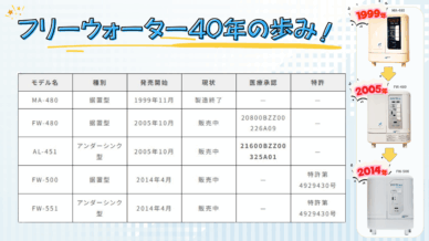 40年の信頼と進化。電解水の未来へフリーウォーター(電解水生成器)」は、約40年間にわたり、品質向上と技術革新を追求し続けてきました。その歩みは、1999年に登場した初代モデル「MA-480」から始ま...